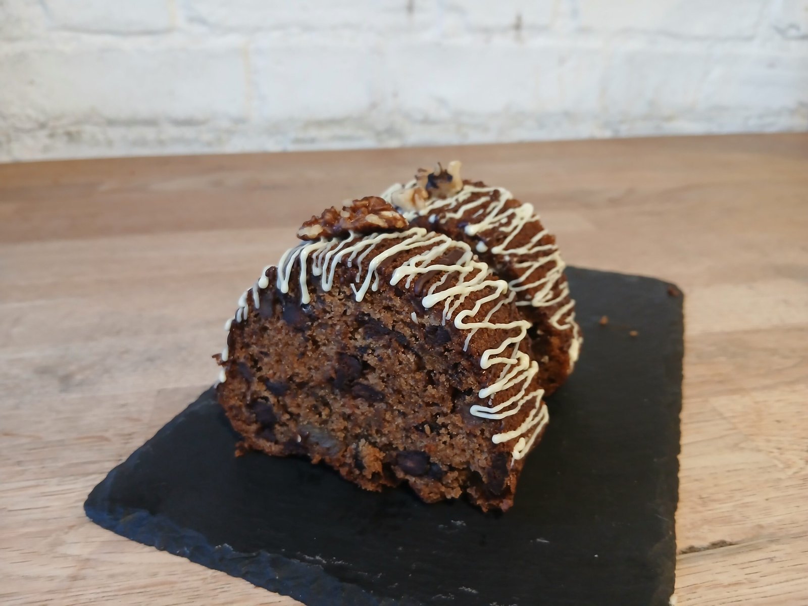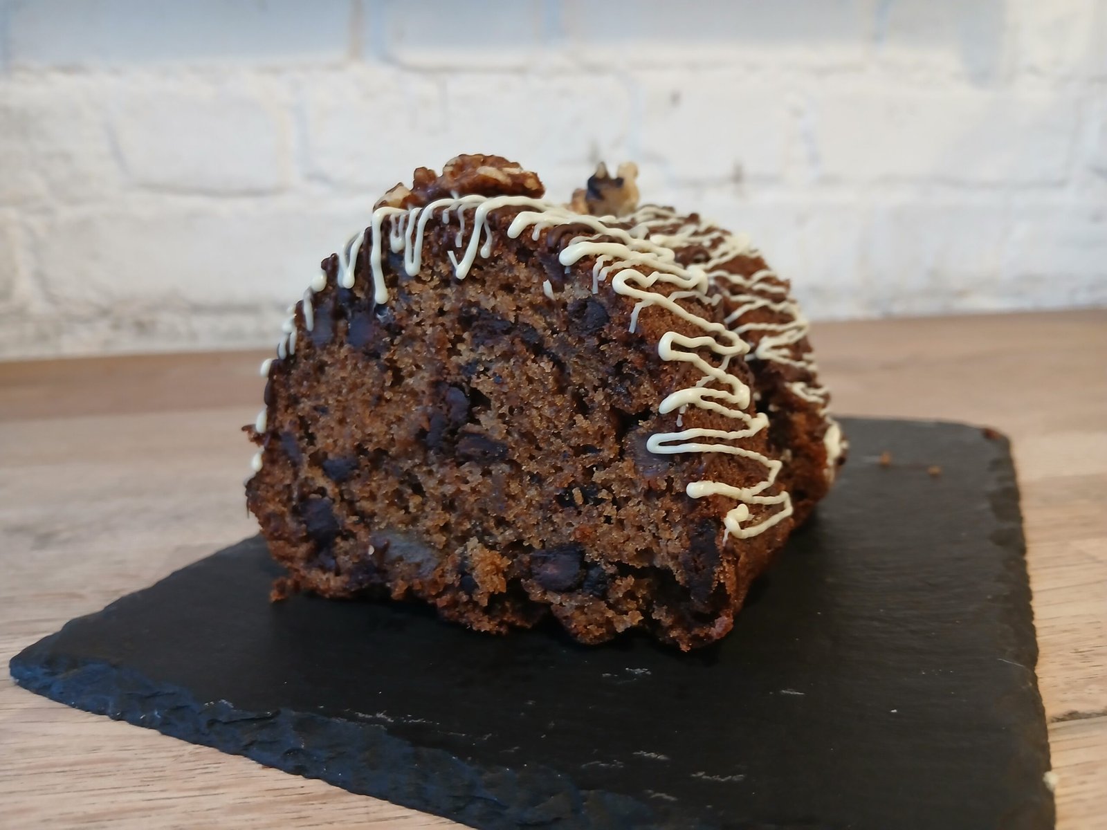 Ingredients: Butter, sugar, egg, wheat flour, cacao power, honey, walnut, almond, banana, baking powder, salt,