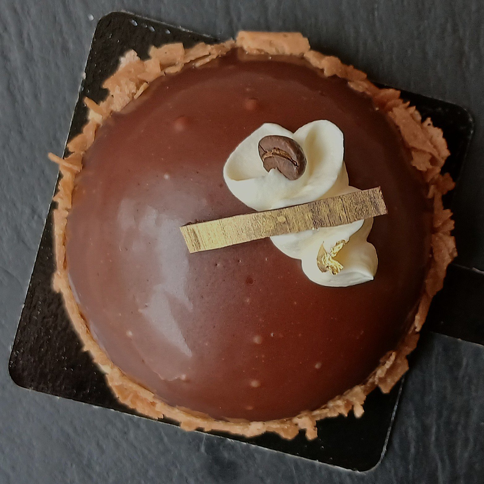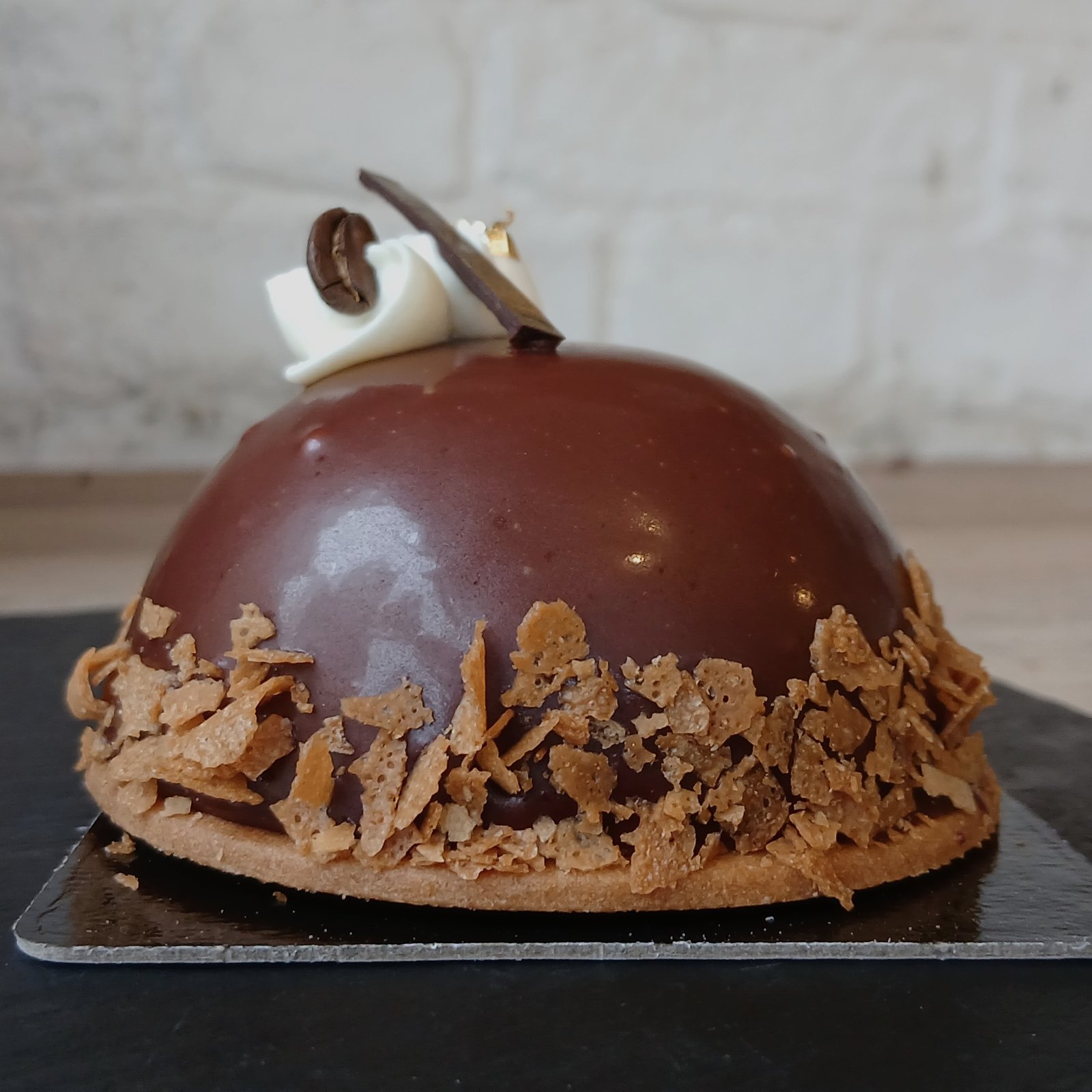 Ingredients: Sweet paste (flour, butter), Sponge (flour), chocolate-coffee ganache (soy lecithin), Mascarpone Crème Diplomate (milk/cheese), Dark chocolate glaze, Feuilletine, gelatine.